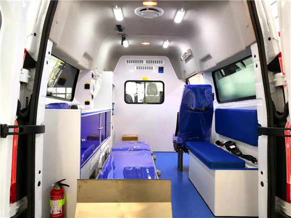 后門上車踏板,醫(yī)用耐磨塑料地板,緊急救護十字標志,后艙空調(diào)及暖風;