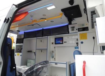 醫(yī)療艙配有自動上車擔(dān)架(含3副安全帶),不銹鋼下護板,上車引導(dǎo)板,可上下兩層分離的擔(dān)架1套。