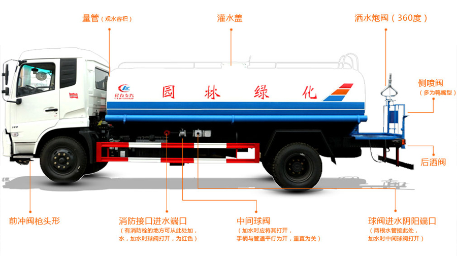 上裝配置:罐體采用4mm厚武鋼集團(tuán)供應(yīng)的罐車專用板材制作,實(shí)際容積2立方,罐內(nèi)防浪隔板具有防波作用,減低罐內(nèi)液體的沖擊。配備65QZ-40/45型大功率灑水車專用水泵,可自吸自排,引水時間<8min,流量40m3/h,揚(yáng)程45米。其它專用部分標(biāo)配為:前沖、后灑、側(cè)噴、后工作平臺帶360度可調(diào)節(jié)綠化水炮,垂直吸程≧7米,灑水寬度≧14-16米,綠化水炮射程≧20-25米,自流閥、濾網(wǎng)、消防接口(可連接消防栓取水,可作應(yīng)急消防用)。罐前量管(觀察罐內(nèi)水位)、罐后爬梯、罐上罐口帶簡易護(hù)欄、罐側(cè)雙炮筒,罐體表面雙層油漆工藝,防銹、耐腐蝕,其余有廠家標(biāo)配?蛇x擇加裝加裝藥盤、氣動控制閥、噴藥設(shè)備、罐內(nèi)防腐等。