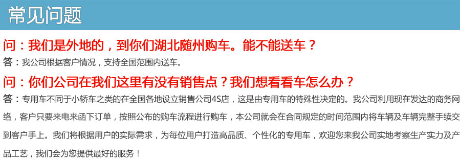 售后服務承諾 我們遵循的質量方針是:"產品領先是我們永恒的目標,用戶滿意是我們不懈的追求,優(yōu)質服務是我們最好的承諾。"為此,我們做出如下承諾: 一、免費維修方案及期限 1、跟蹤服務時間:終身; 2、自交客戶之日起,在正常使用范圍內,行駛1萬公里內或一年內免費修理(不包括易損件和電器部分),超過一年,只收取零件費; 3、服務到位時間:本省24小時內到達;其它地區(qū)24小時內派出人員; 4、每年定期或不定期走訪各地用戶,征求意見,實施有效改進措施和召回制度。 二、免費期后配件供應價格方式 1、方式:根據(jù)用戶要求,由用戶在所在地底盤技術服務站統(tǒng)一供貨或由我廠售后服務部直接供給配件; 2、配件只收工本費,不加其他費用; 三、產品底盤故障,請按底盤廠家在就近服務站維修,具體地址詳見隨車發(fā)送的底盤服務站名錄或直接撥打電話查詢。
