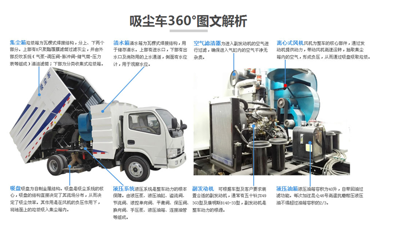 五十鈴吸塵車采用不銹鋼方形廂體,獨立垃圾箱,后傾翻機構,液壓升降,操縱機構,(手動+電動)集中式控制面板,車廂與后門密封,液壓自動鎖緊,無泄露。副發(fā)動機采用五十鈴78馬力發(fā)動機。